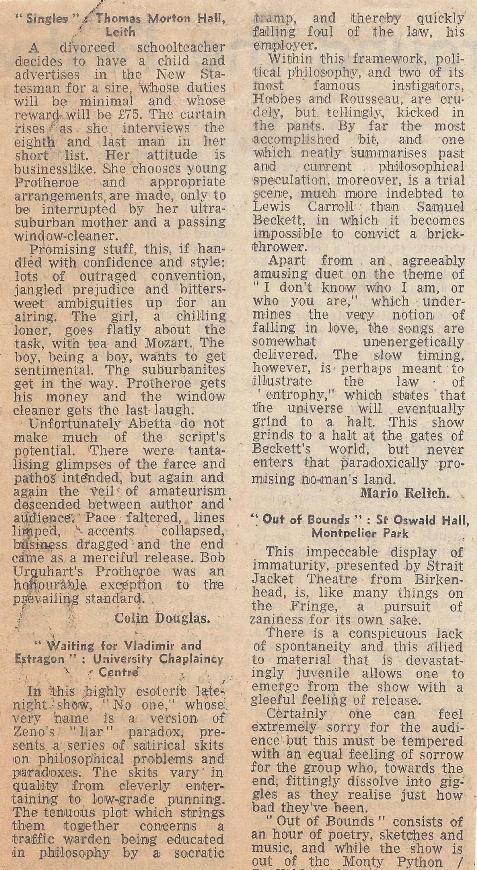 “Apart from an agreeably amusing duet on the theme of “I don’t know who I am, or who you are,” which undermines the very notion of falling in love, the songs are somewhat unenergetically delivered. The slow timing, however, is perhaps meant to illustrate the law of “entrophy,” (sic) which states that the universe will eventually grind to a halt. This show grinds to a halt at the gates of Beckett’s world, but never enters that paradoxically promising no-man’s land.”
